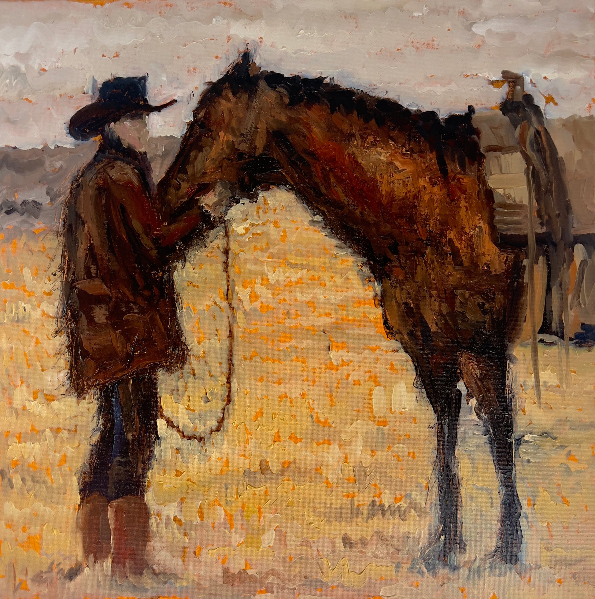 "Tethered Souls" is an oil on canvas painting that captures the quiet yet profound connection between a cowboy and his horse. Set against a rugged, impressionistic backdrop, the piece portrays the cowboy standing beside his horse, gently petting its head. The warm tones of the cowboy’s brown jacket and the soft expression between the two convey a deep, unspoken bond. The textured brushstrokes evoke the raw, untamed spirit of the relationship, illustrating the trust and understanding shared between these two companions. At 16" x 16", this intimate moment reflects the silent strength and unity that defines their journey together.